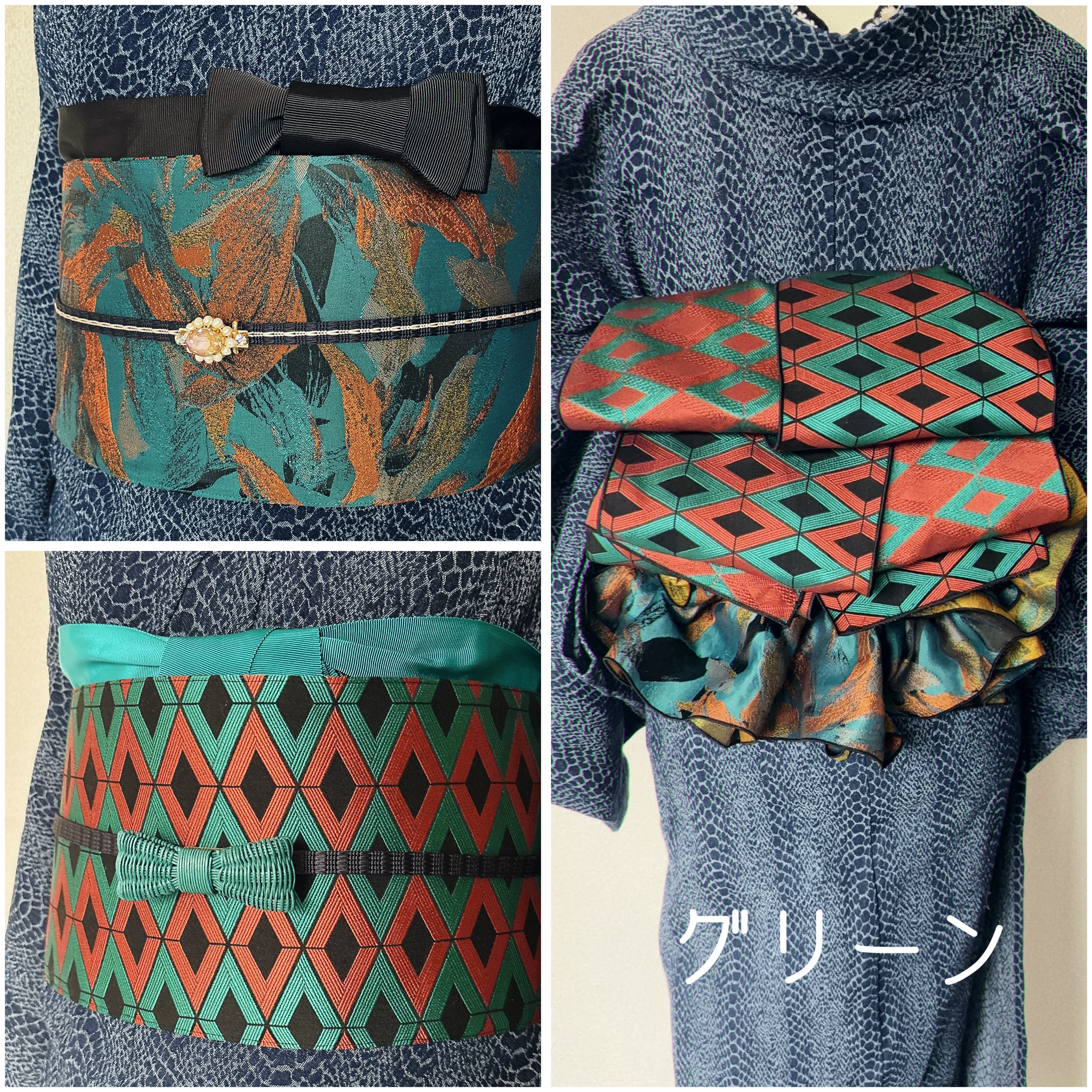 さらに、ペプラム風でおはしょりを可愛く隠したり、たれを前に持ってきて帯揚げ風に…この帯ならではの様々なアレンジが自在で遊べる和装初心者さんから上級者さんまで楽しめる創作帯です!!