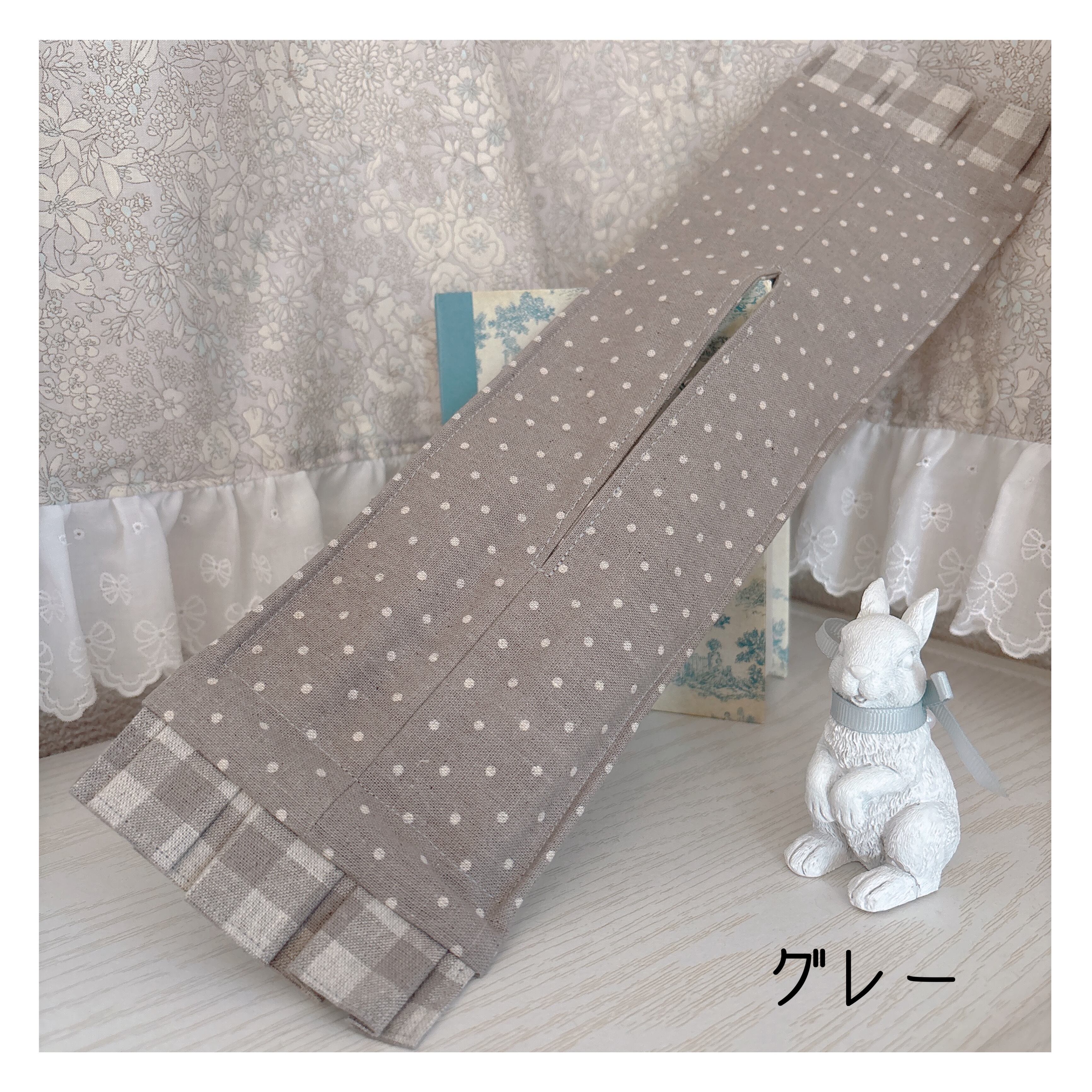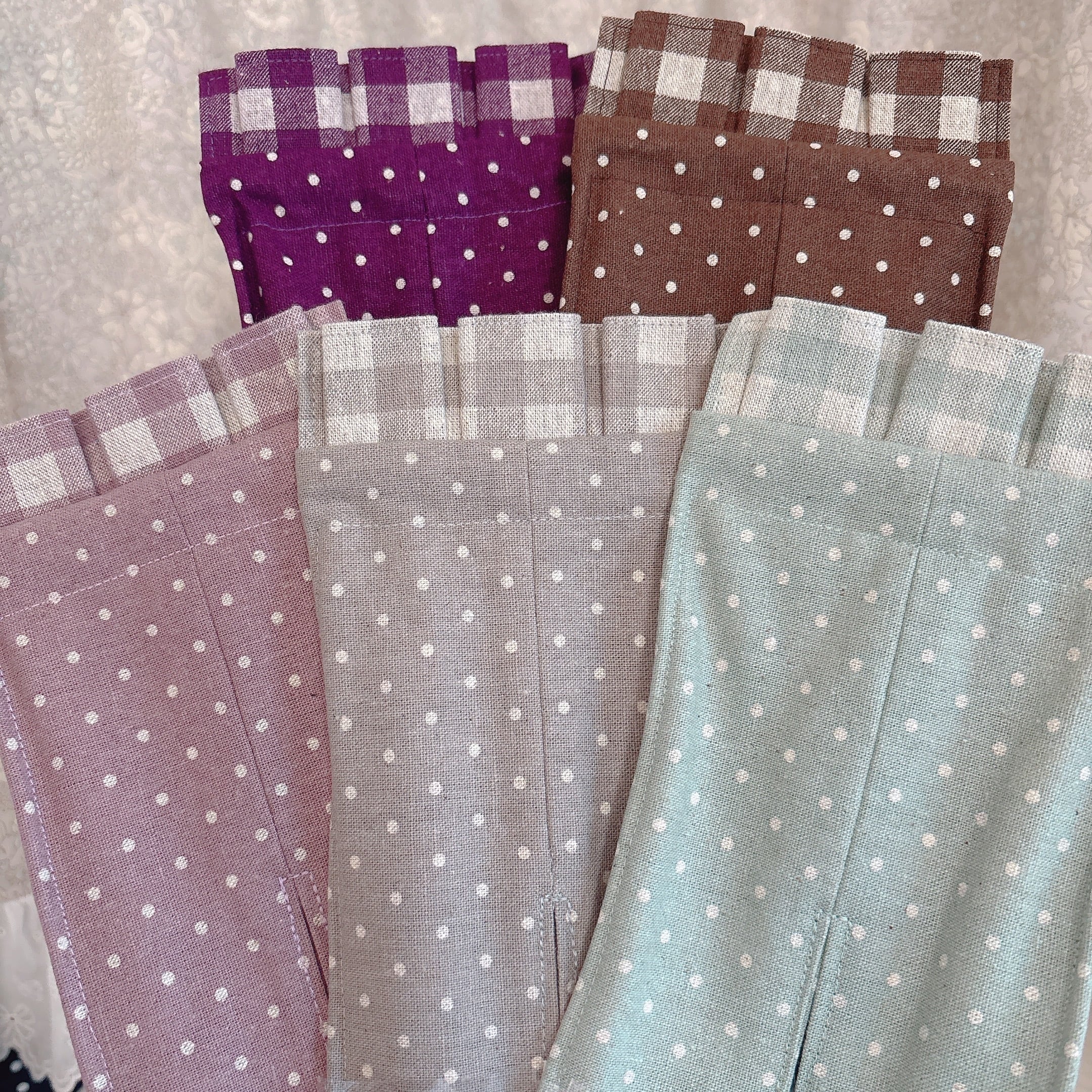 こちらは、綿麻素材にくすみカラーなドット生地、フリル部分は同色のチェック柄がナチュラルな雰囲気が可愛い仕上がりになりました