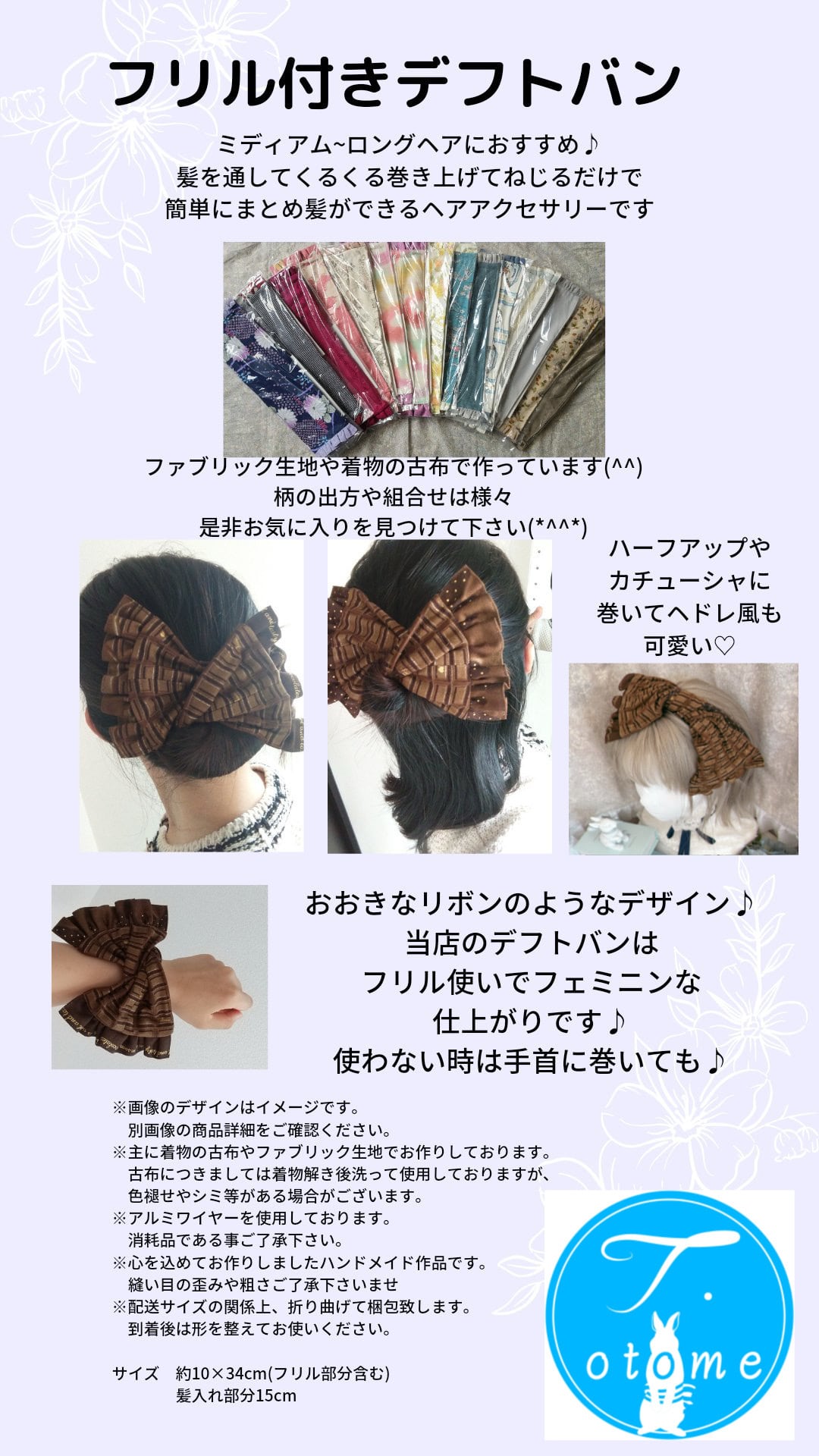 T.otomeのデフトバンはファブリック生地やキモノの古布を使用し、両サイドにはフリルがついています♪